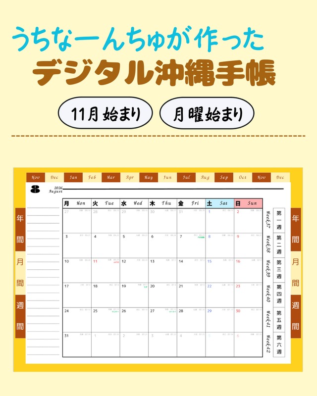 沖縄で生活する全てのひとへ 仕事でもプライベートでも使って欲しい そんな想いで作りました。 カレンダーには沖縄特有の行事も加え 沖縄での生活により役立つものとなっておりますので 是非使ってみて下さい。 ーーーーーーーーーーーーーーーーーーーーー 本製品はPDFとなっており Goodnoteなどのアプリで 手書きで使うことができる仕様となっております。 ーーーーーーーーーーーーーーーーーーーーー カラー展開は2色で マンゴー×パイン トロピカル×シャーベット 使っていて楽しくなる様な色合いで 仕上げてみました。 ーーーーーーーーーーーーーーーーーーーーー 内容は ・年間カレンダー ・月間カレンダー ・週間カレンダー ・メモページ となっており、リンクも設定しています。 本製品の特徴として、通常の祝日に加え 旧盆などの沖縄特有の行事、旧暦、六曜も 記載されています。 ーーーーーーーーーーーーーーーーーーーーー カレンダーの期間:2025年11月〜2026年12月 曜日:月曜スタート 1年を通した週数も記載しています。 ーーーーーーーーーーーーーーーーーーーー こちらの商品カラーは マンゴー×パイン お間違えのない様ご注意ください。
